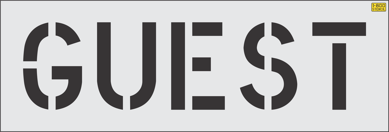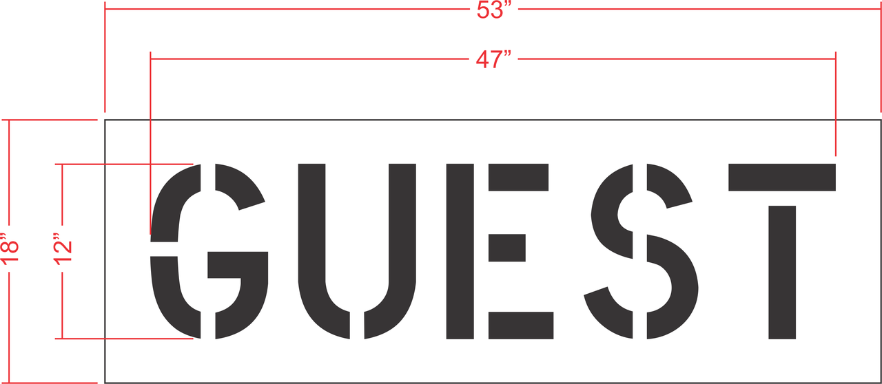 This 12 inch GUEST stencil is the perfect fit for any parking space or in front of doors. The 12" GUEST stencil is 47" wide and has a letter height of 12" along with our standard 3" of over spray. All 1-800-Stencil’s are professional quality and made from either Light or Pro-Grade LDPE, Aluminum, or optional UHMW plastic to all last for years of professional use.