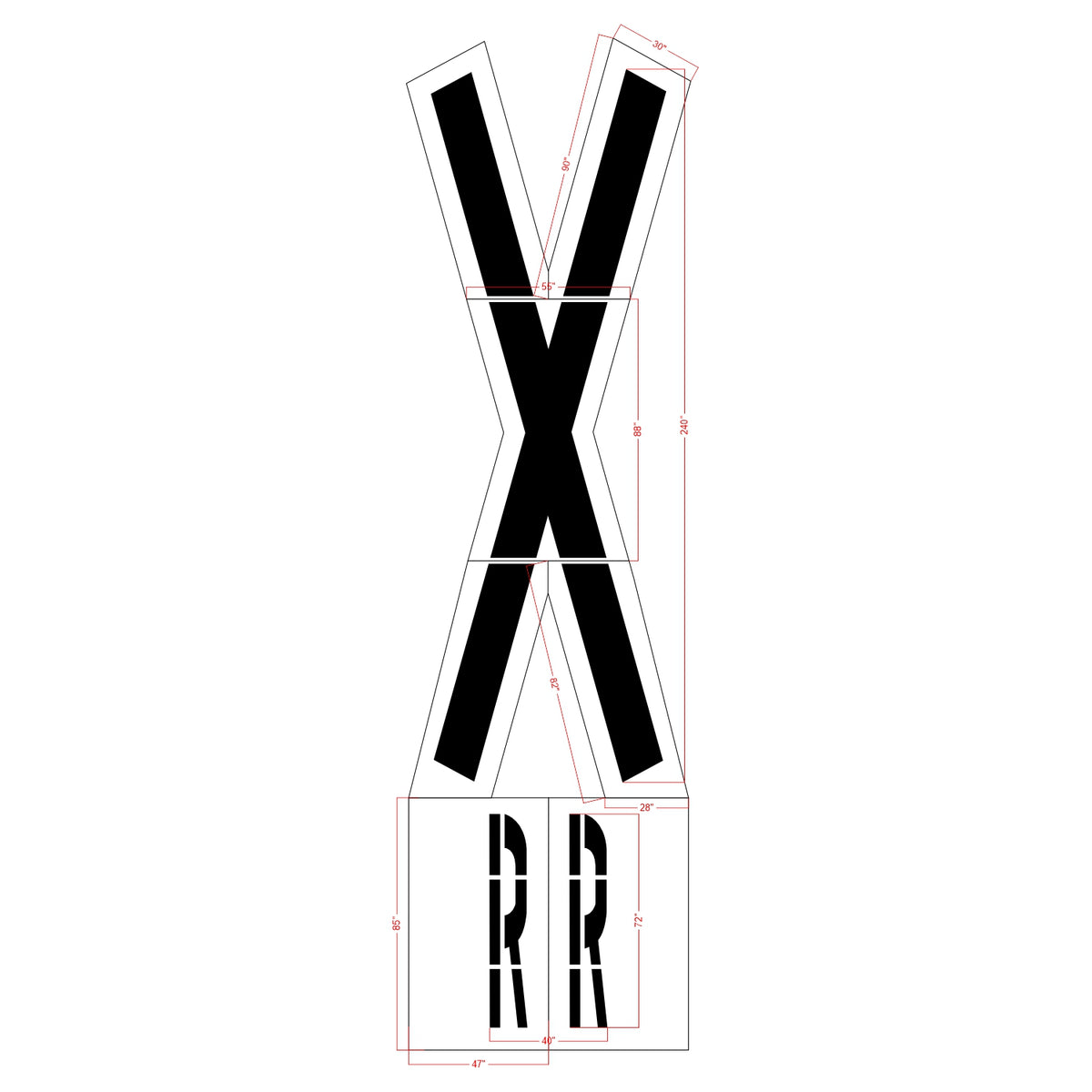 This 239" New Jersey DOT Railroad Crossing Kit complies with the specification and standards of the state's Department of Transportation. The height of each "R" is 6 ft., and the overall height of the "X" is 239 inches. A ll 1-800-Stencil’s are professional quality and made from either Light or Pro-Grade LDPE, Aluminum, or optional UHMW plastic to all last for years of professional use.