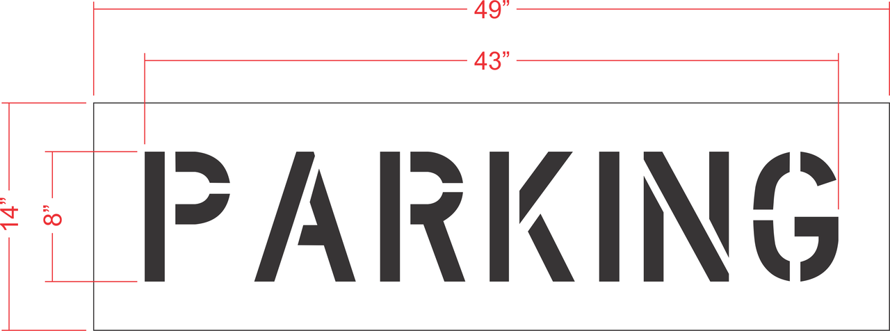 The 8 inch PARKING stencil is great for parking garages, sidewalks, or warehouses because of its size. This 8" PARKING stencil has a width 43", along with a height of 8", and comes with our standard 3" of overspray. All 1-800-Stencil’s are professional quality and made from either Light or Pro-Grade LDPE, Aluminum, or optional UHMW plastic to all last for years of professional use.