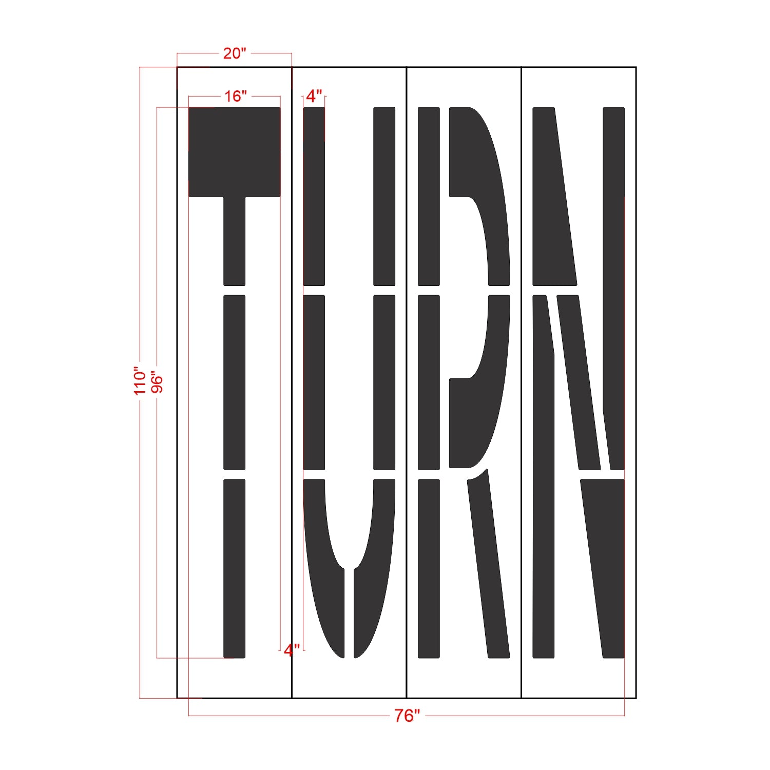 Pavement markings play a crucial role in directing, cautioning, and regulating traffic through the use of words, symbols, and arrows. These visible markings on the road surface are essential for guiding drivers, warning them of potential hazards, and ensuring proper traffic flow. That is why this 96" California DOT "TURN" Wording Stencil is made specifically to meet the specifications for the Department of Transportation's Manual on Uniform Traffic Control Devices or MUTCD. All 1-800-Stencil’s are professional quality and made from either Light or Pro-Grade LDPE, Aluminum, or optional UHMW plastic to all last for years of professional use.